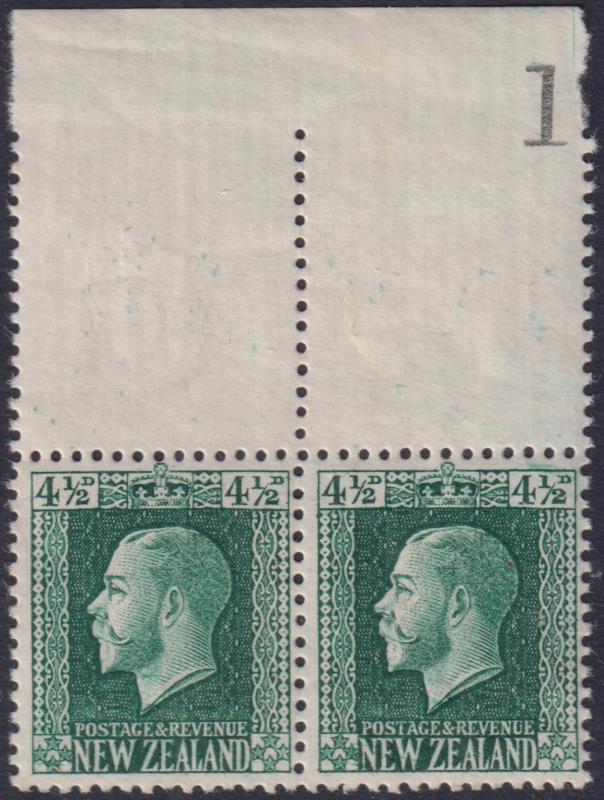 1915 4½d GV upper selvedge horiz pair, p14 x 13¼, "D" letter wmk & part sheet No. CP K6a. Cat $180. Fresh MUH. (Image)