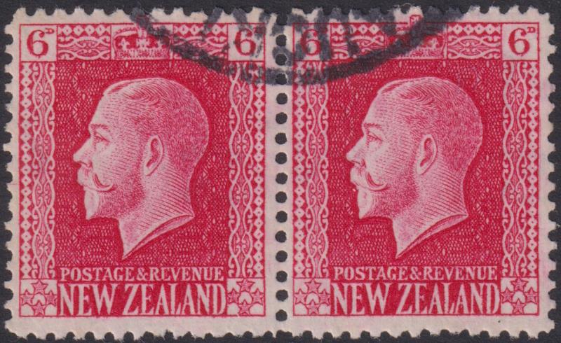 1916 6d GV carmine horiz pair, sideways wmk ("pictorial" paper), line p14. Canc very partial "Auckland" cds (no date visible),