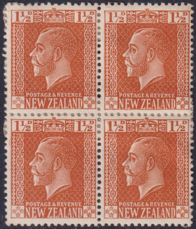 1918 1½d GV orange-brown surface block of 4, DLR, officially patched (horizontally). CP K17b. Mint/MUH. (Image)