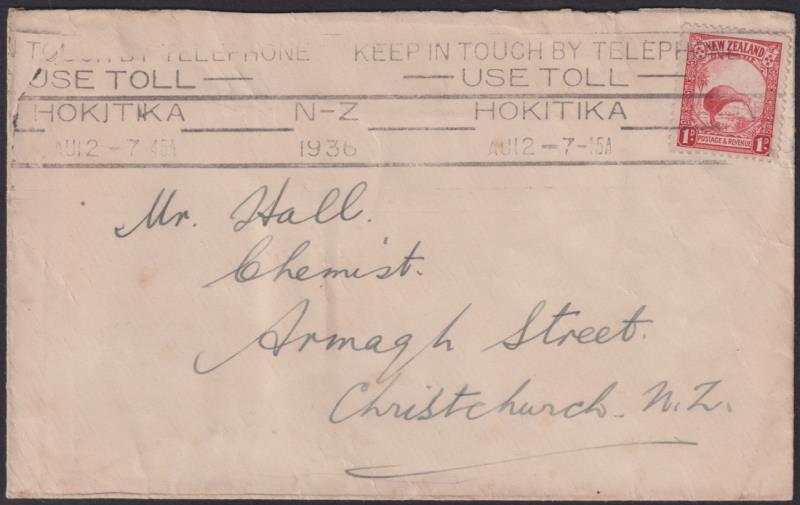 1167 C image1936 1d Kiwi, p13½ x 14 on cover to Christchurch, Hokitika 12 August continuous cancel. FU. (Image)