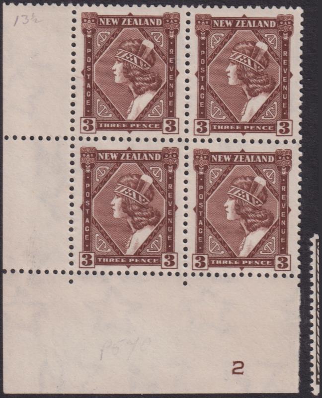 1161 M 1935 3/- Mt Egmont, p13½ x 14, single wmk, lower selvedge example with plate No (1). CP L14b. Cat $1400 as block of 4. VLH mint.