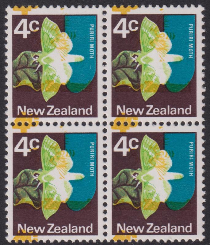 1973 4c Moth block of 4, no wmk, yellow colour offset (unlisted by CP). MUH.