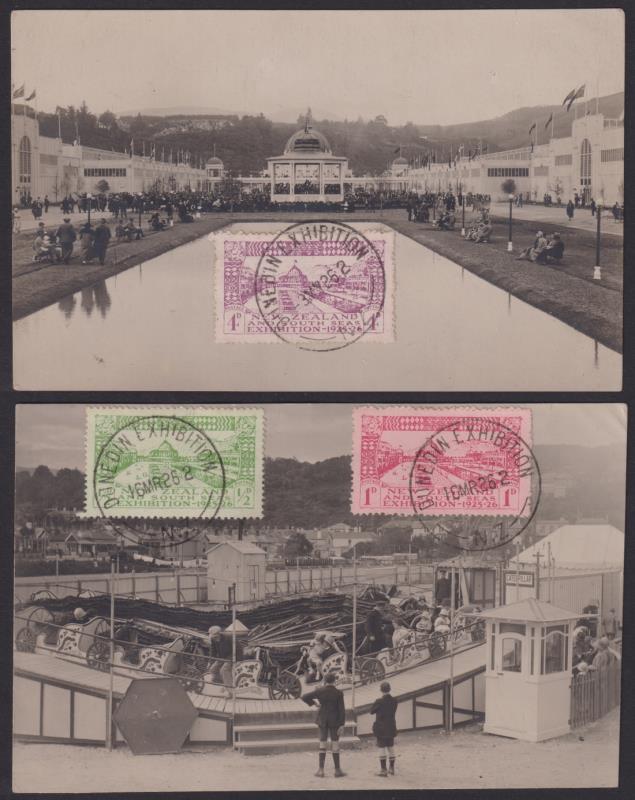 1925 ½d & 1d Dunedin Exbn with 16 March 1926 Exbn cds on view side of "Caterpillar" ride B & W PPC & 4d with 3 May 1926 Exbn cds