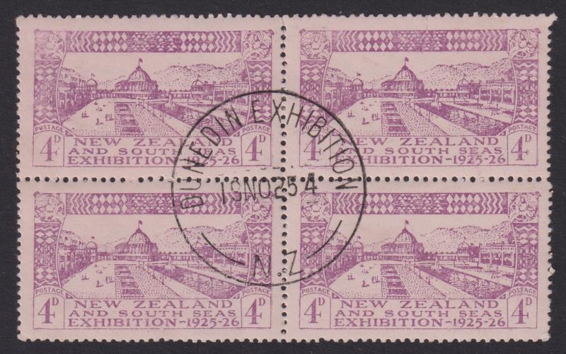 1925 4d Dunedin Exbn in block of 4 with Exbn cds (18 NO 25). Jury cat $ 600. FU. (Image)