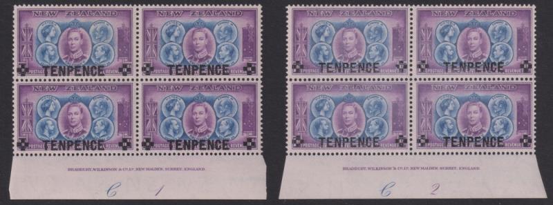 1944 10d on 1½d Sovereigns - plate blocks of 4 - C1, C2. CP cat $40. MUH. (Image)