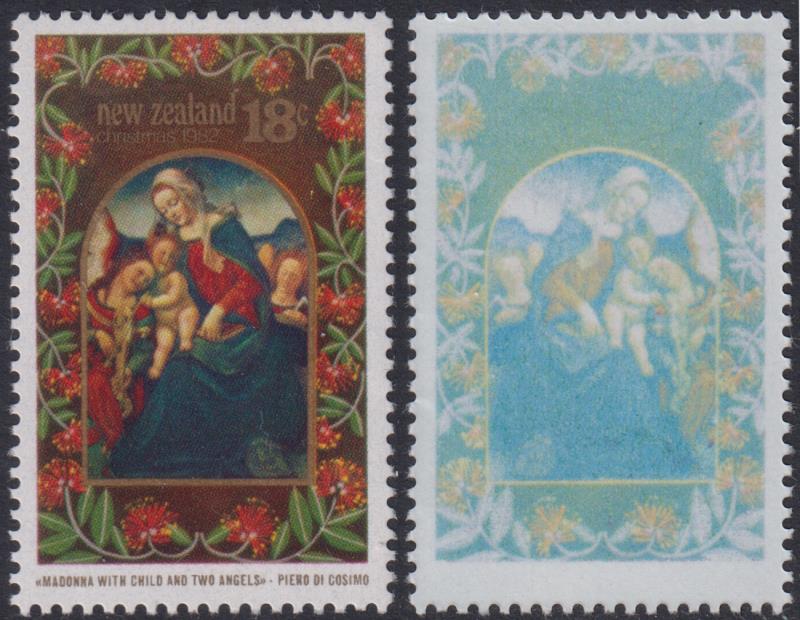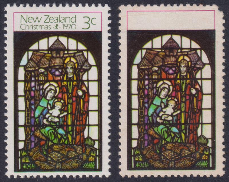 1970 (3c) Christmas, olive colour ("New Zealand Christmas 1970 3c") missing. Short top R/H corner, minor blemishes. With normal.