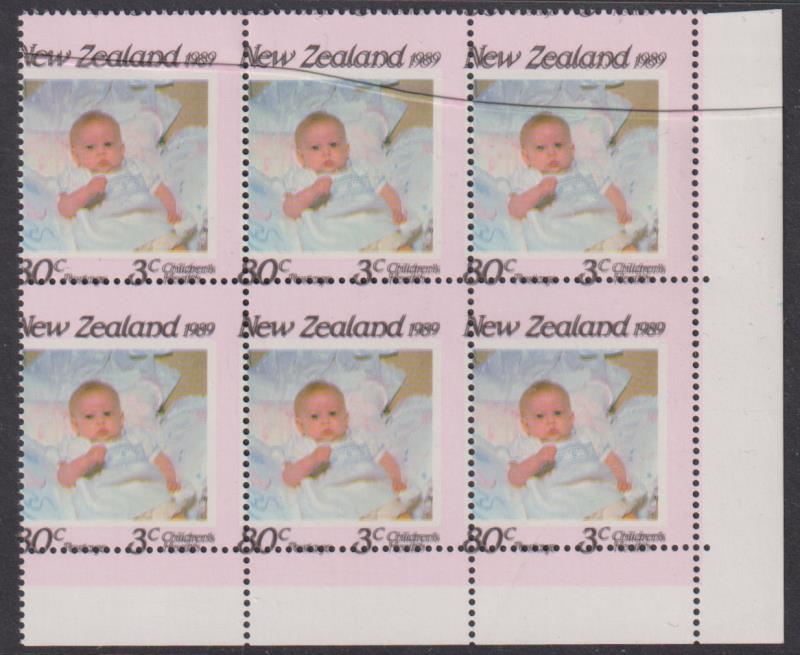 1583 * image1989 80c + 3c Princess Beatrice, lower RH sheet cnr, horiz blk of 6 error: triple black print caused by strong pre-printing paper crease across 3 upper stamps also resulting in misplaced perfs MUH. STRIKING unlisted error. (Image)