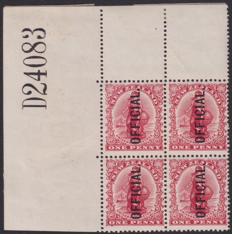 1593 * image1907 1d Universal redrawn top L/H corner block of 4 with sheet number D24083. Jury cat $1400+. MUH (hinging on selvedge). (Image)