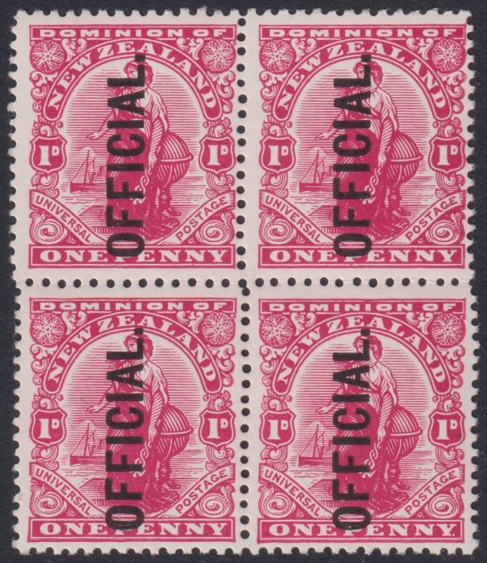 1925 1d Dominion block of 4, Cowan paper. CP JO6a. Cat $280. MUH. (Image)