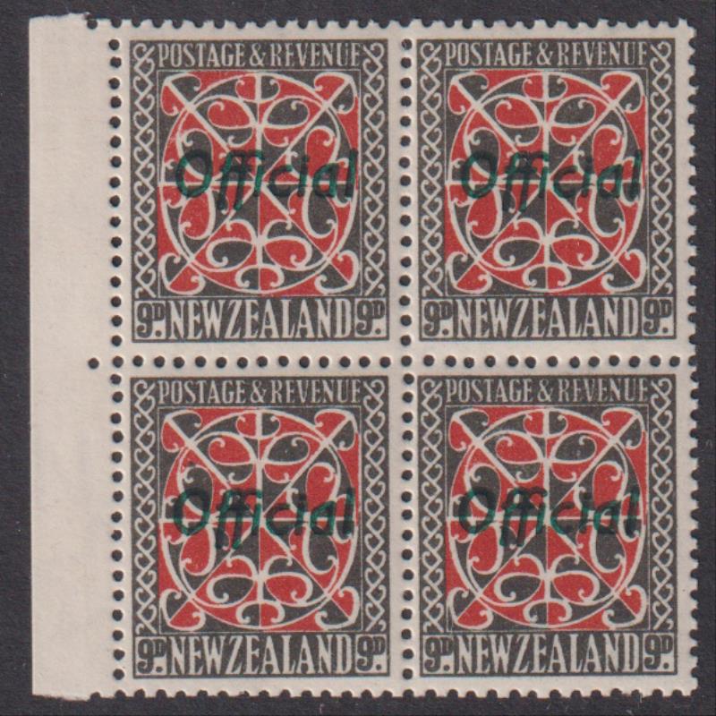 1935 9d Panel, green ovpt block of 4. Jury cat $1800. MUH. (Image)