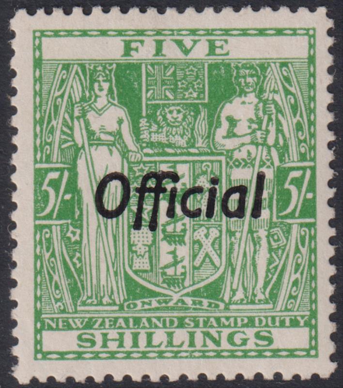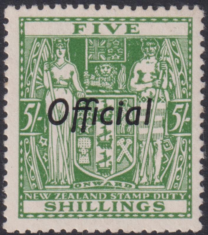 1943 5/- Arms horiz ovpt, WT, mult upright wmk. CP ZO33c. Cat $125. MUH. (Image)