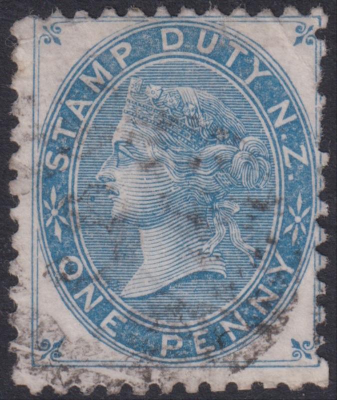 1878 1d QV Stamp Duty blue, o/c, slight gum discolouration, faint toned perfs. Jury cat $600. Mint.