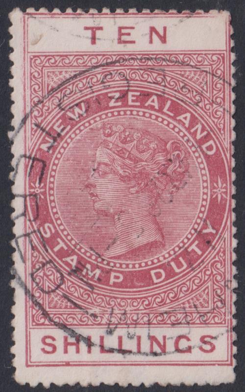 1927 10/- QVLT maroon, p14½ x 14, Cowan paper, reversed wmk. FU canc light "Blenheim / Registered" cds 1 MR 28?. Very faint