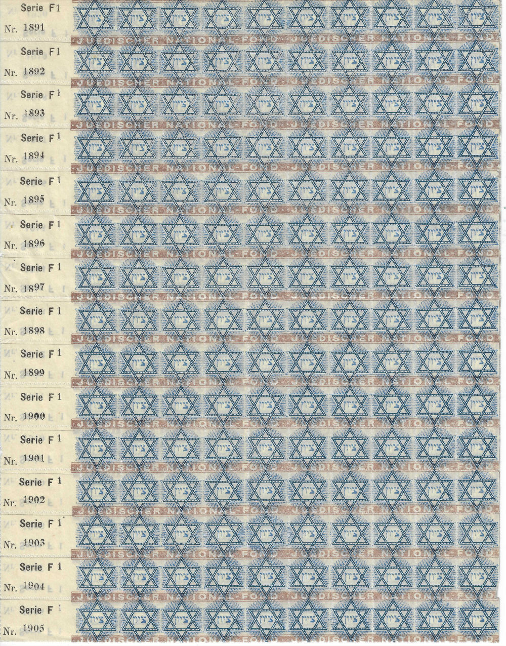 1 imageJNF ZION STAMP (ROCH 1B) Serie F1 (France), rows 1891 through 1920, fold after row 1903, does not have left most counterfoil, [PH CROPPED] (Image)