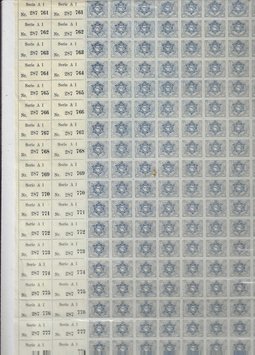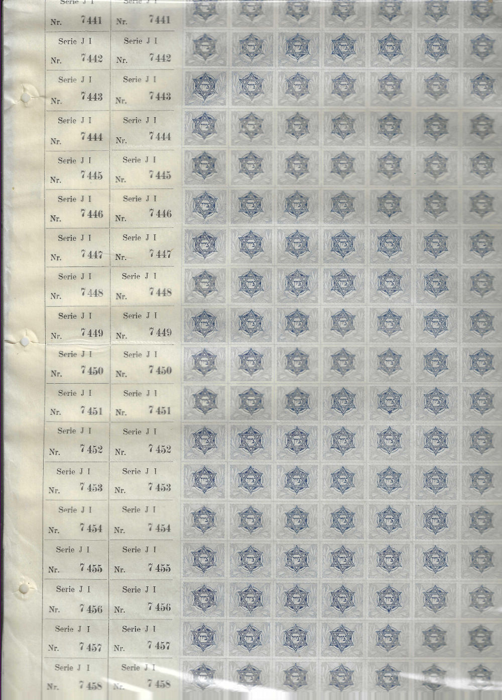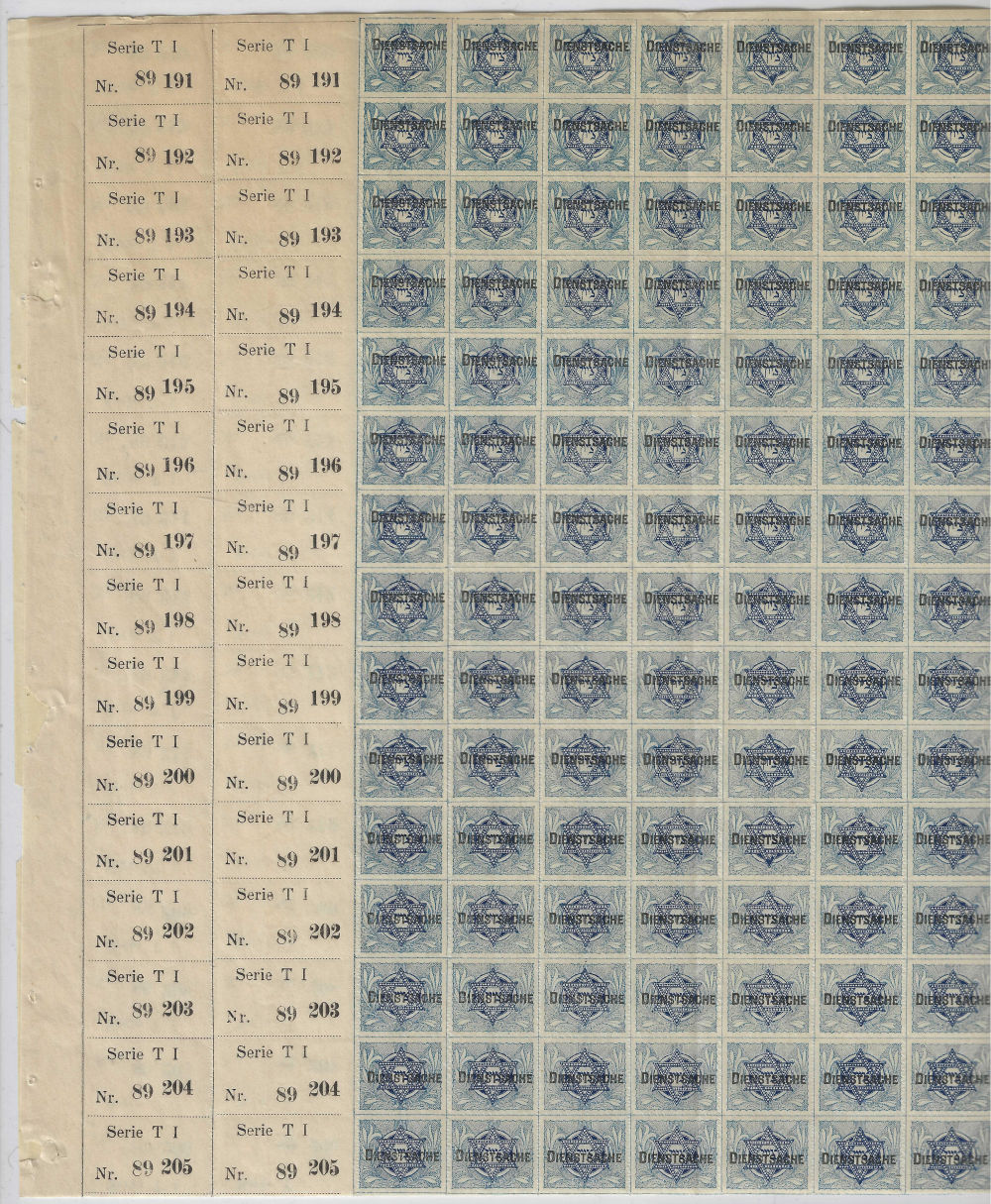5 imageJNF ZION STAMP (ROCH 2LLa) Serie T 1 (Italy), overprinted DIENSTSACHE rows 89,191 through 89,820; FULL SHEET, folded after row 89,.205 [PH CROPPED] (Image)