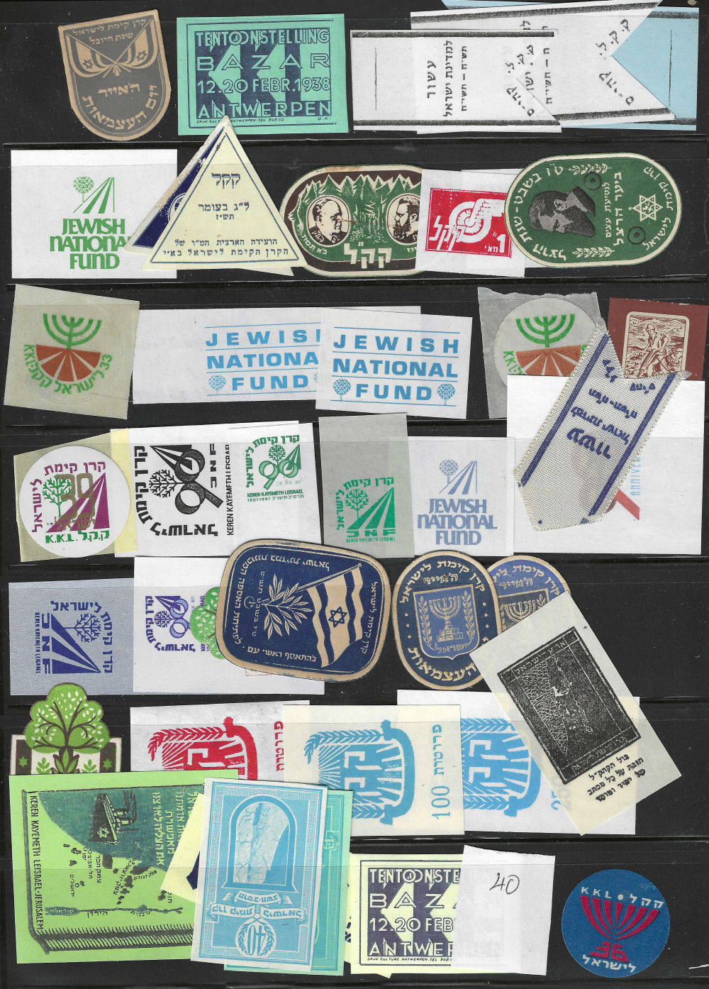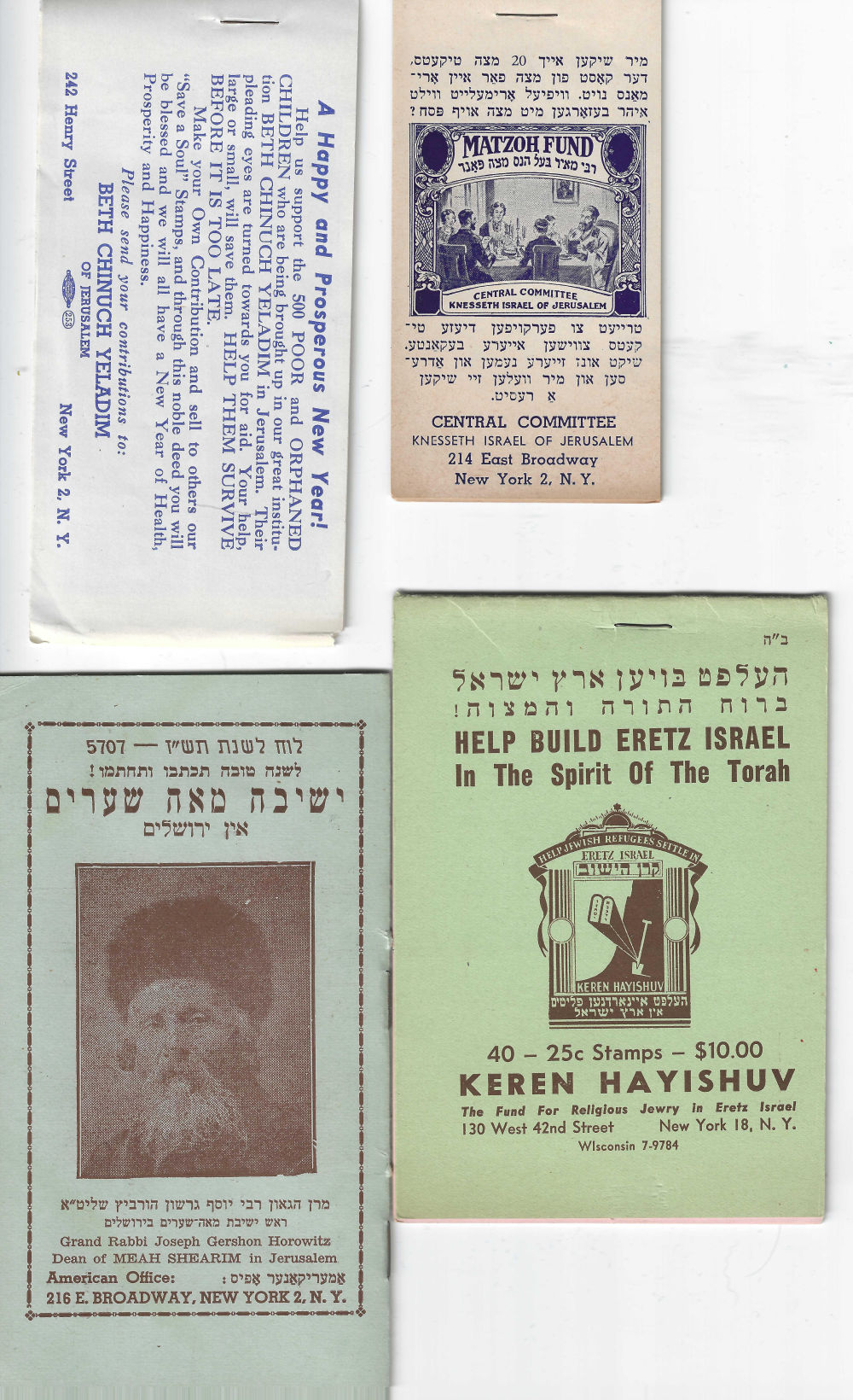18 imageCHARITY SEAL BOOKLETS BEALS NUMBERS (1) 14.4x Beth Chinuch Yeladim: Help the poor and orphaned 10 c (2) 38.5x Central Committee Knesset Israel Shanah Tovah 25 c [2 copies, one missing a pane] (3) 38.8 same, Matzoh fund 25 c (4) 64.6a Tifereth Zion W’ Yerushalyim Help the poor immigrants 10c orange (5)66.8 General Israel Orphan’s Home: 10c (6) Emergency Matzoh Fund 50c (7)111.27 United Charities of Jerusalem New Year (8) 131.4 Keren Hayishuv: Eretz Israel, pink labels (9) Palestine Educational and Benevolent Relief Society: Help the orphans and the poor 10 c (1) Yeshiva Meah Sharim 5707 calendar; PER BEALS $270 (Image) (Image 2) (All Images)