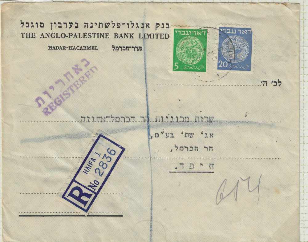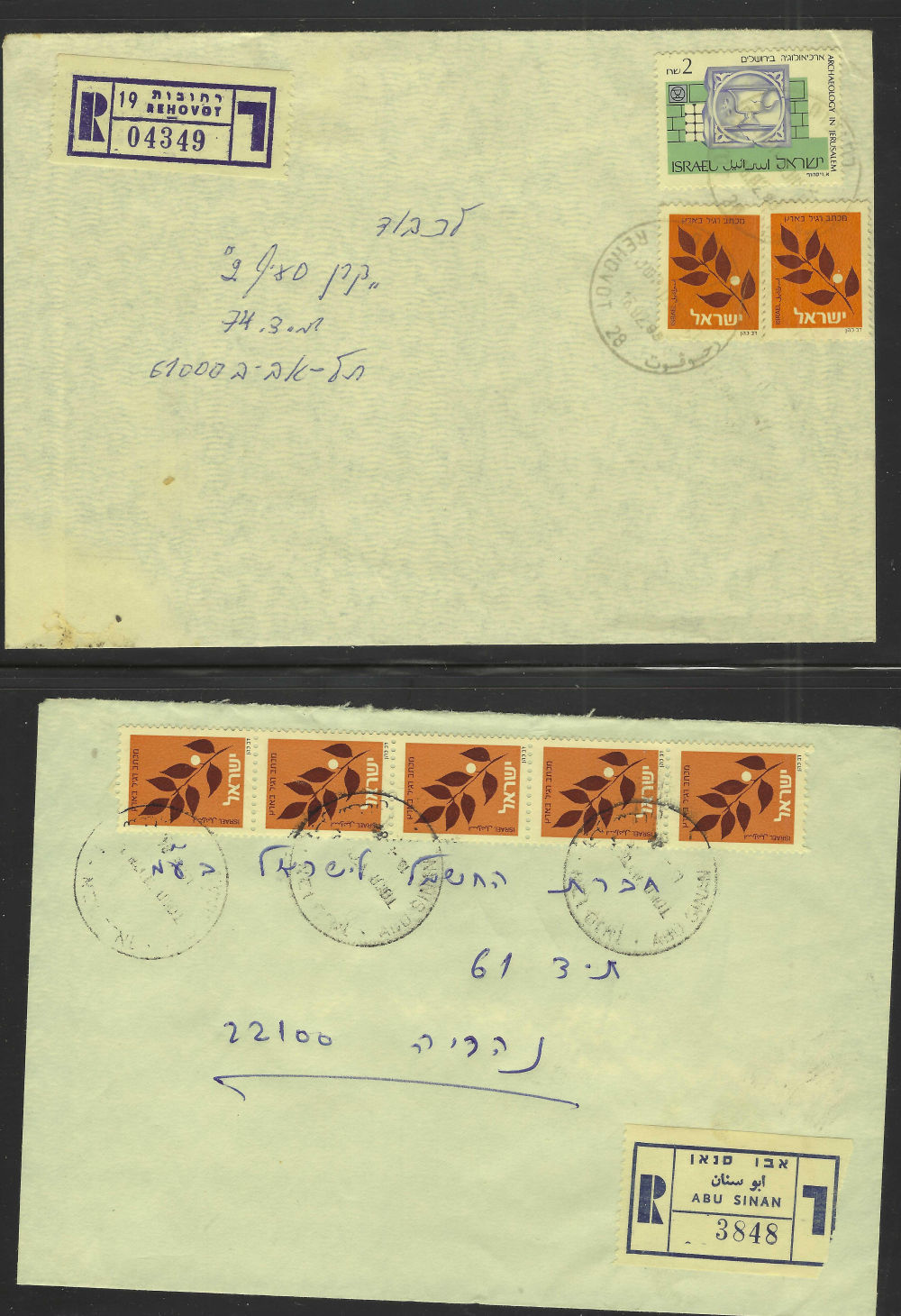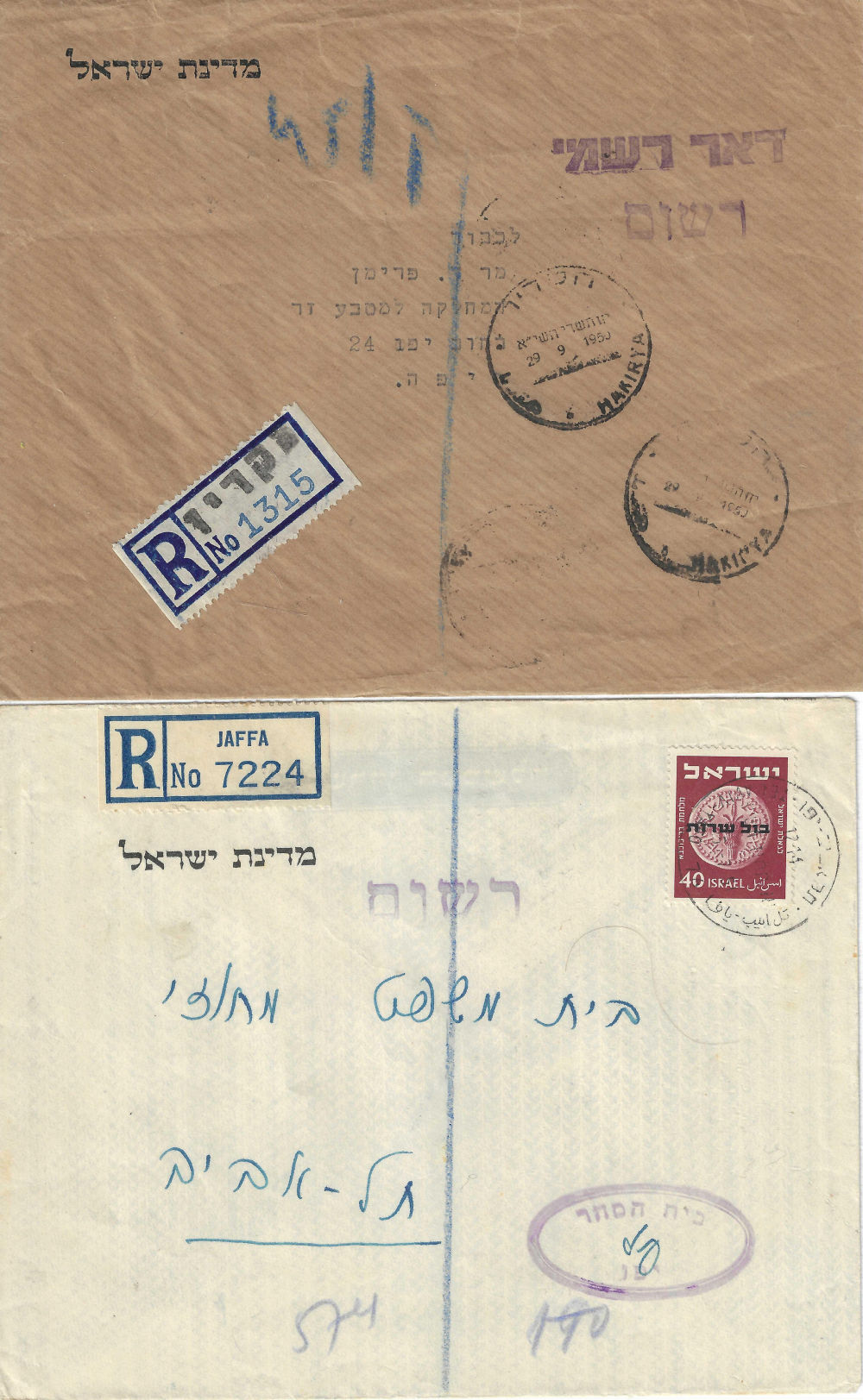 177 c imageOFFICIAL REGISTERED (1) STATE OF ISRAEL entire, pmkd HAKIRA 29/9/1950; r-label with hstmpd city name (2)40 pr official tied by TEL AVIV JAFFA date unclear, r-label JAFFA; hstmp of a jail; backstamps on both (Image)