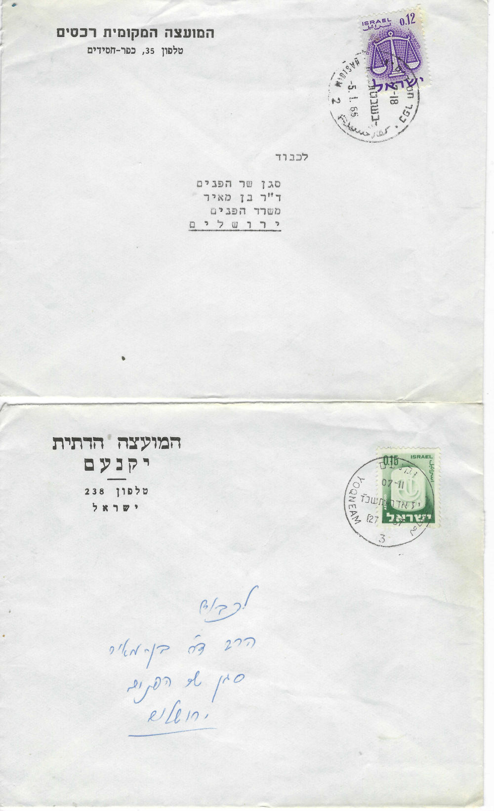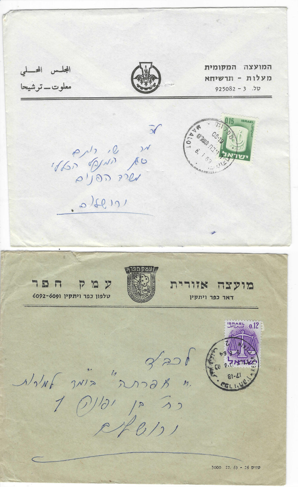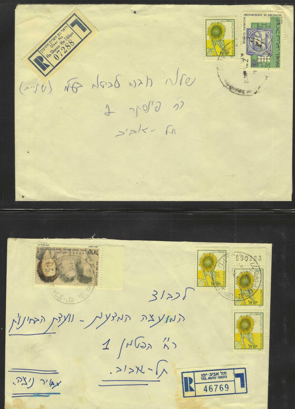177 c imageOFFICIAL REGISTERED (1) STATE OF ISRAEL entire, pmkd HAKIRA 29/9/1950; r-label with hstmpd city name (2)40 pr official tied by TEL AVIV JAFFA date unclear, r-label JAFFA; hstmp of a jail; backstamps on both (Image)