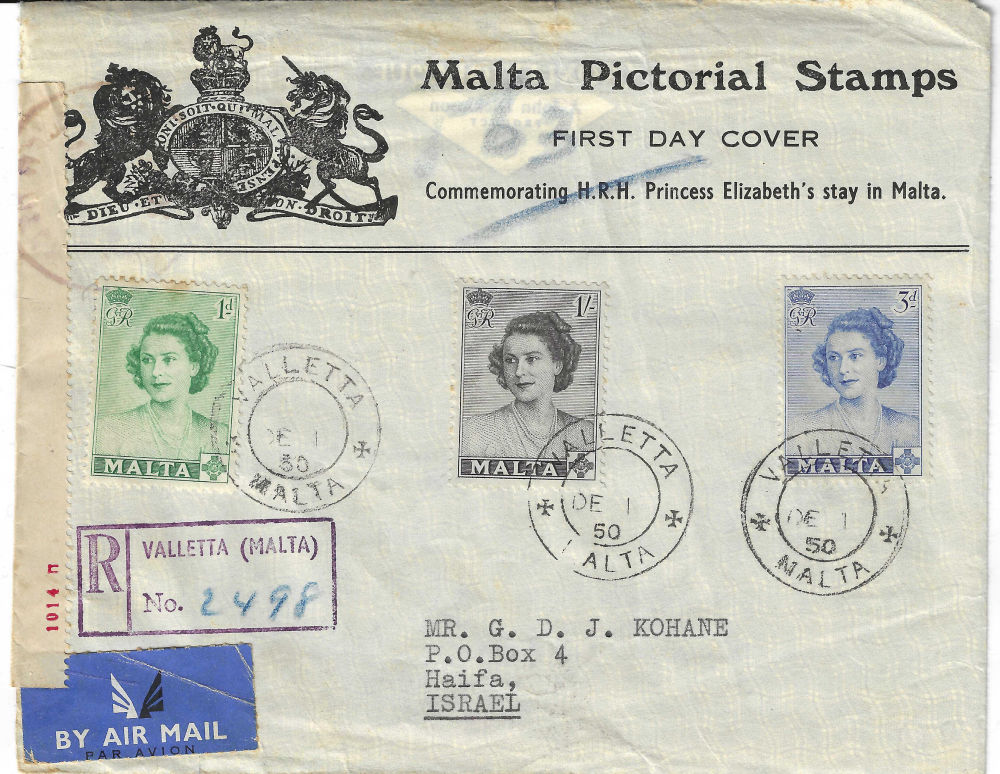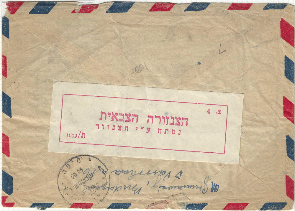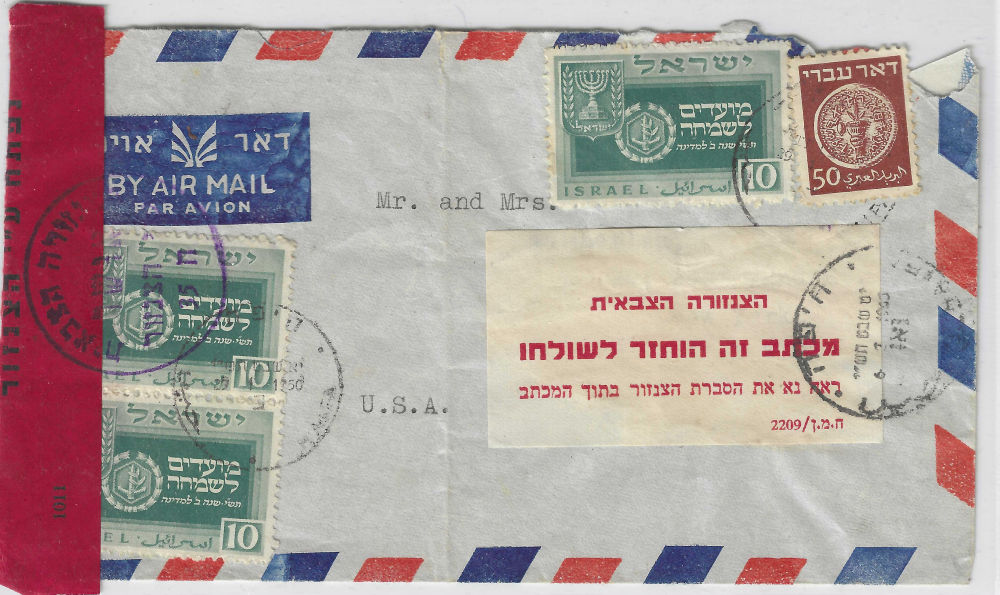 179 c imageCENSORED & RETURNED airmail entire pmkd HAIFA 5/1/1950 (?) addressed to USA, red censor tape to left tied by MILITARY CENSOR hstmp, label (Military censor / Return this letter to the sender / Please see the explanation inside” tied by HAIFA 16/1/1950 pmk; the contents are missing; flap missing piece (Image)