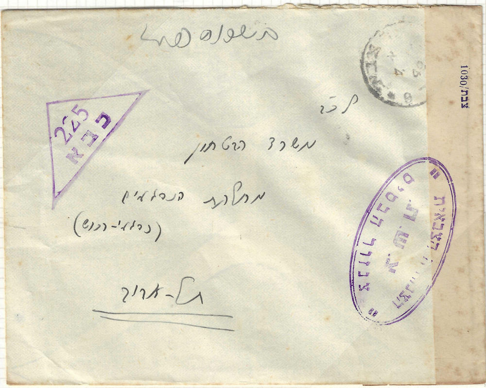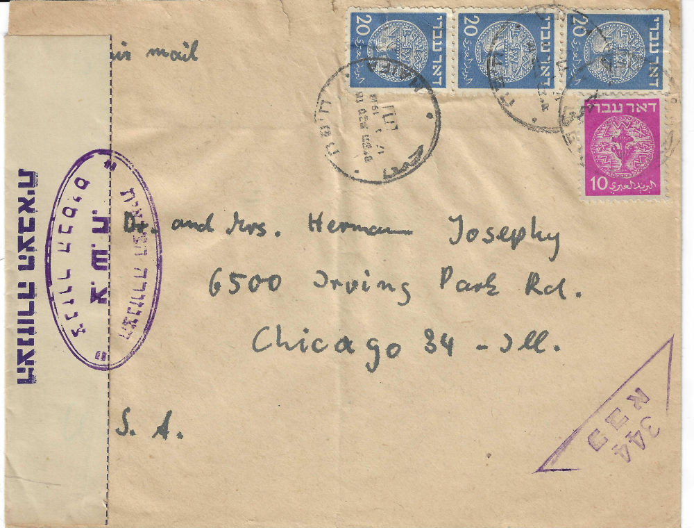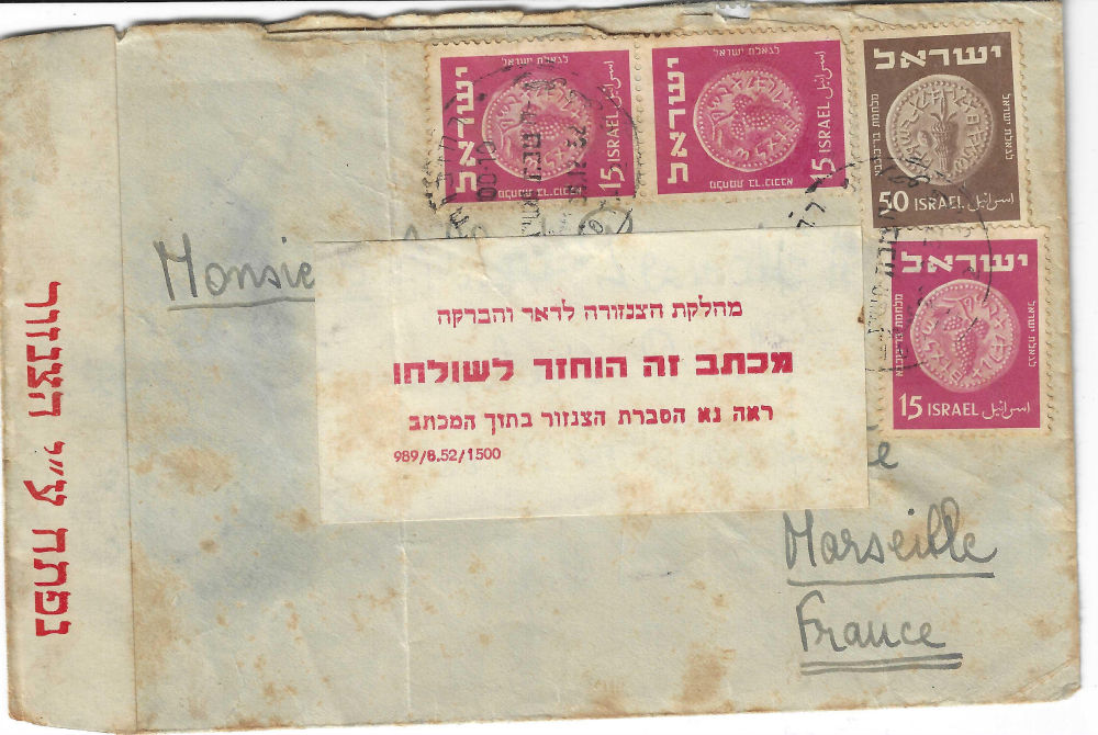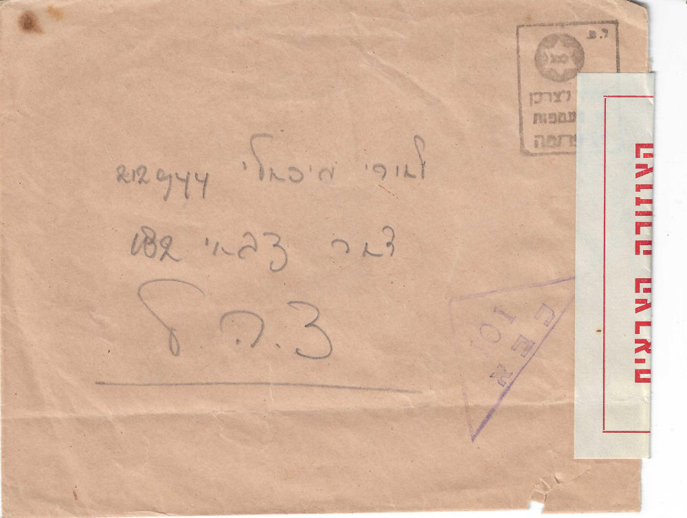 180 c imageISRAEL CENSORSHIP – MILITARY AND OTHER Covers to within or from Israel censored in one form or another, somewhat described and mounted on pages. Dated circa 1948 thru mid-1970’s, but mostly 1948-1959. Various handstamps and/or labels are seen. Over 150 covers in 5 binders. Mostly military. (Image) (Image 2) (Image 3) (Image 4) (Image 5) (Image 6) (Image 7) (Image 8) (Image 9) (Image 10) (Image 11) (Image 12) (Image 13) (Image 14) (Image 15) (Image 16) (Image 17) (Image 18) (Image 19) (All Images)