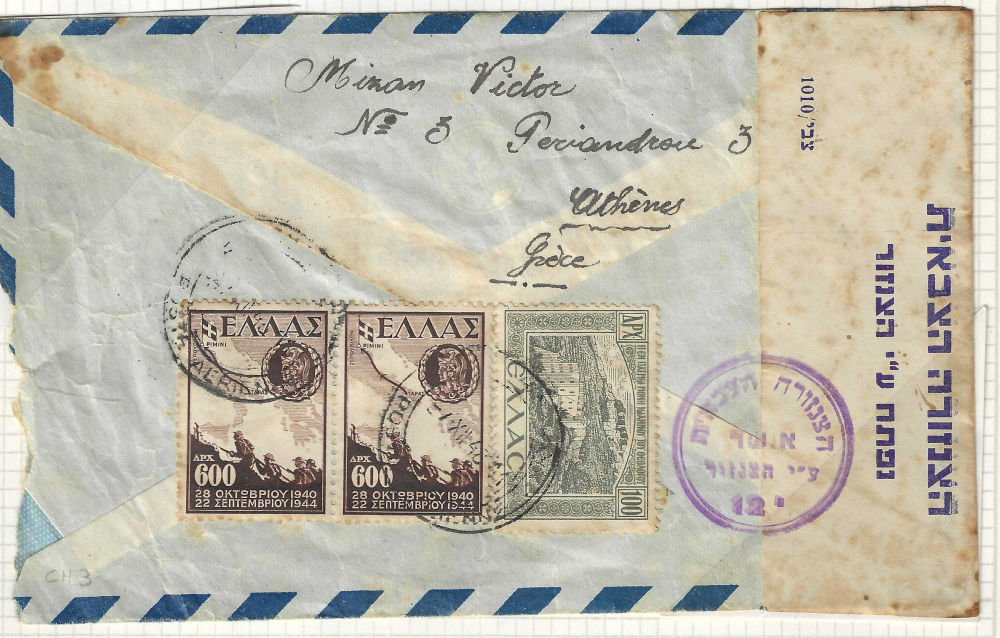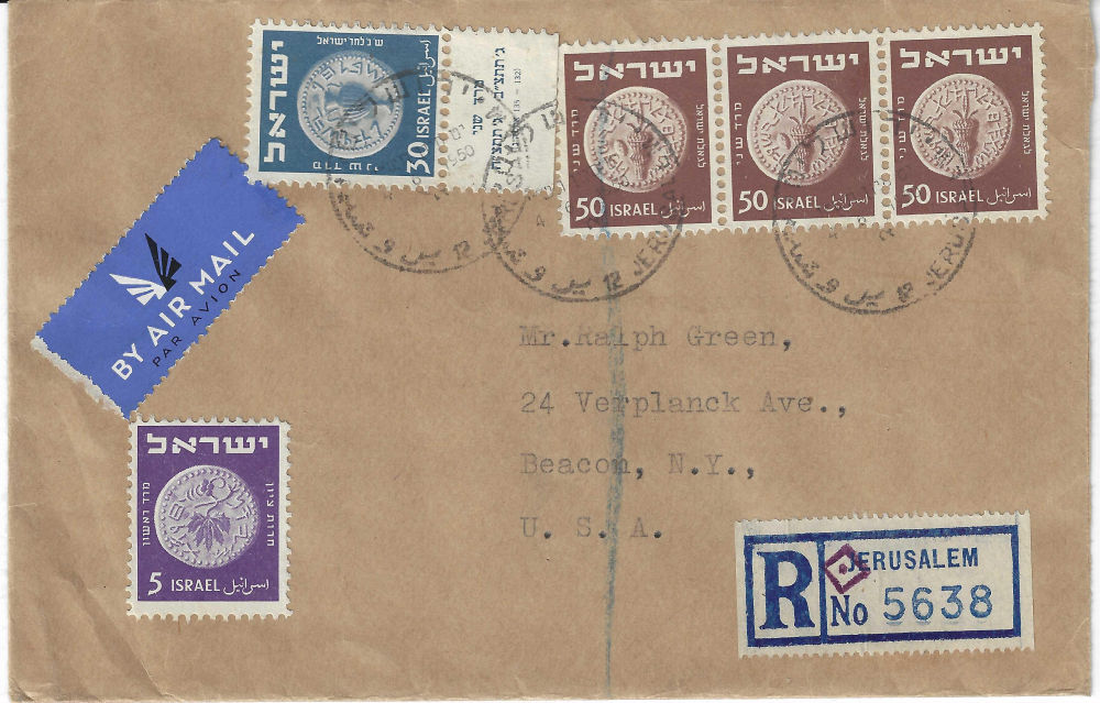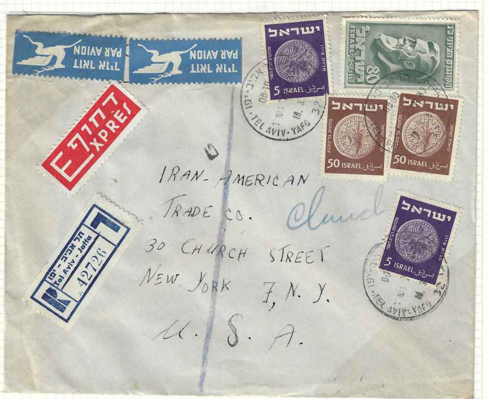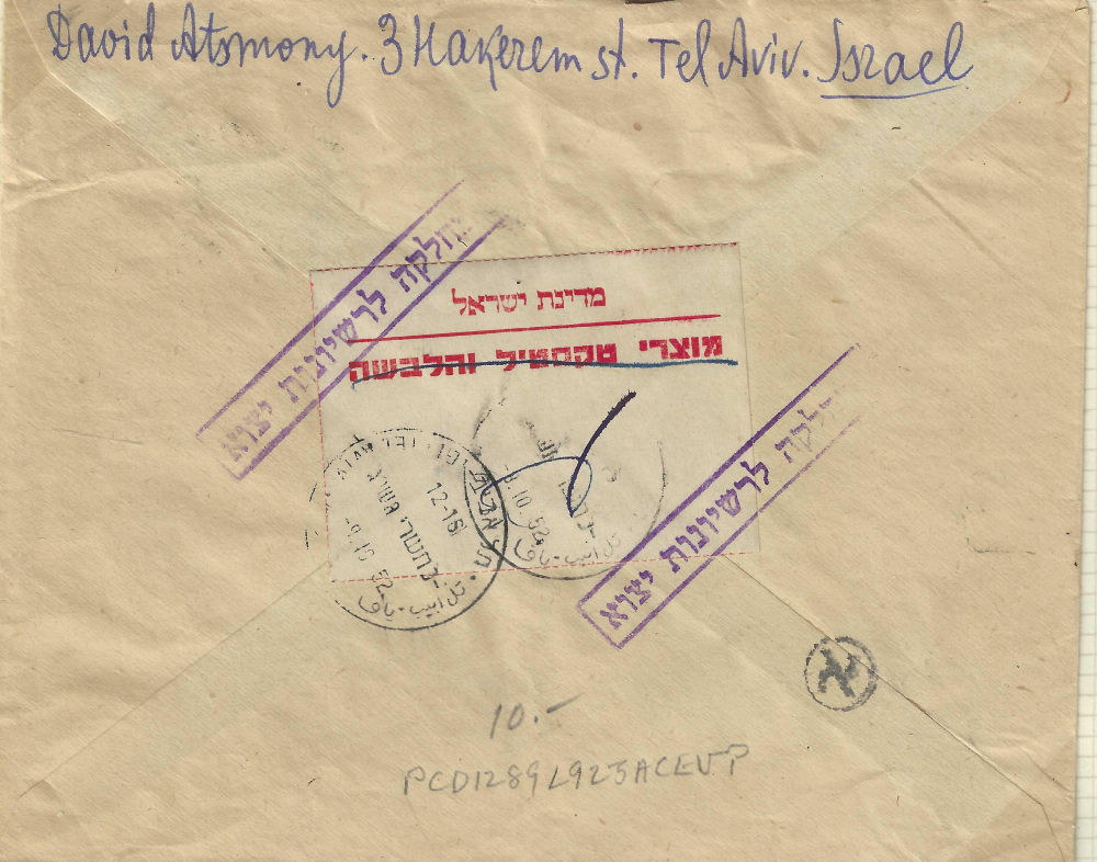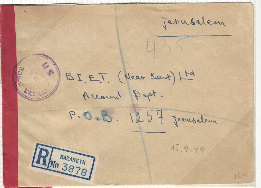 180 c imageISRAEL CENSORSHIP – MILITARY AND OTHER Covers to within or from Israel censored in one form or another, somewhat described and mounted on pages. Dated circa 1948 thru mid-1970’s, but mostly 1948-1959. Various handstamps and/or labels are seen. Over 150 covers in 5 binders. Mostly military. (Image) (Image 2) (Image 3) (Image 4) (Image 5) (Image 6) (Image 7) (Image 8) (Image 9) (Image 10) (Image 11) (Image 12) (Image 13) (Image 14) (Image 15) (Image 16) (Image 17) (Image 18) (Image 19) (All Images)