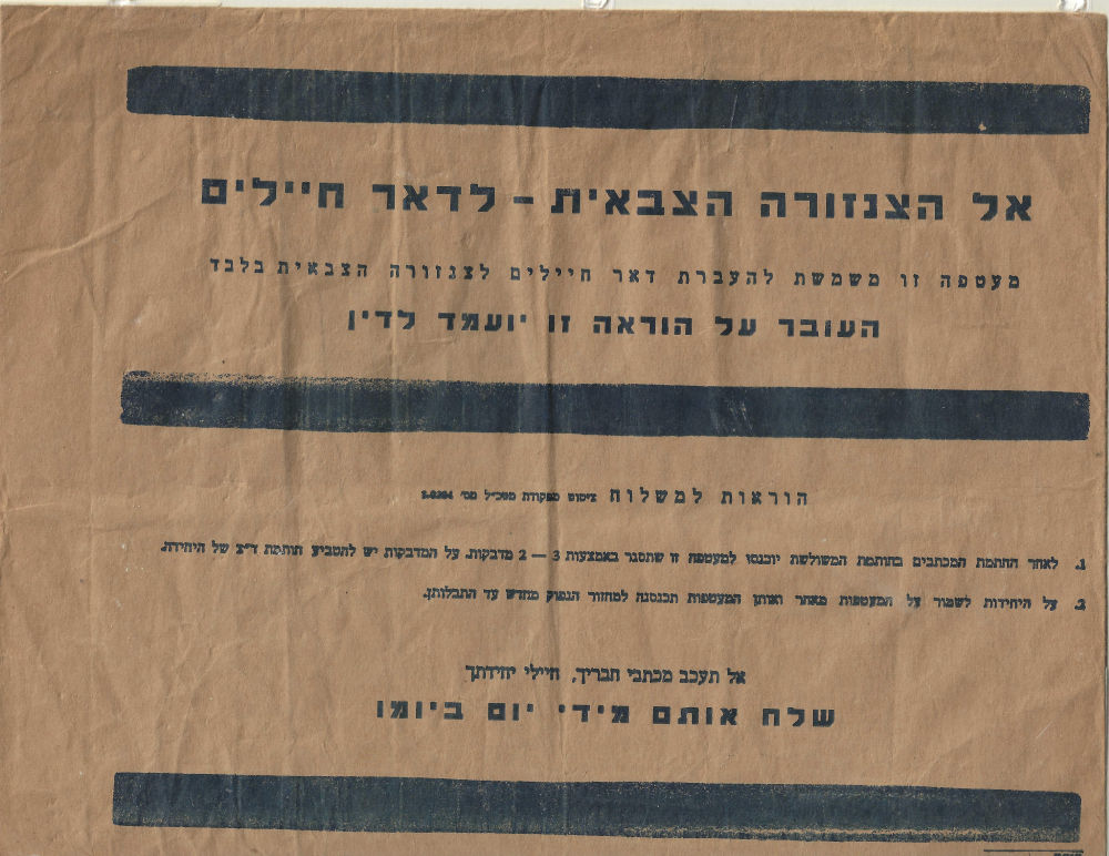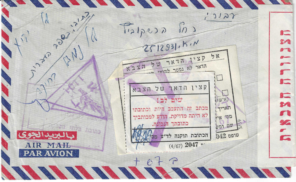 184 nh imageMILITARY CENSOR INTERNAL Entire that was to be used to transfer soldier’s mail for censorship. Not seen on Gladstone’s Postal Censorship in Israel 1948-1978 (Image)