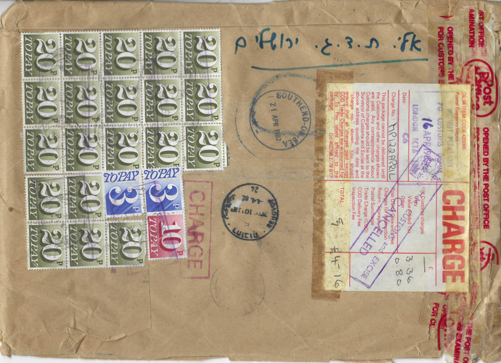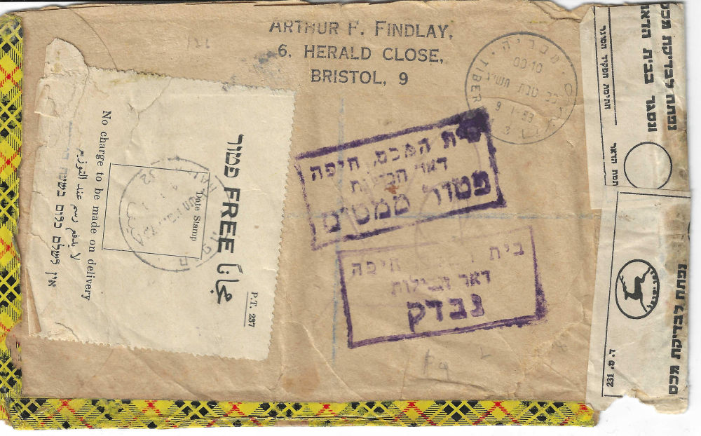 181 imageREGISTRATION AND CUSTOMS package addressed to LONDON; refused and returned to sender Israel green customs form with text in Hebrew and English; British customs form stamp marked CANCELLED [back on web] (Image) (Image 2) (All Images)