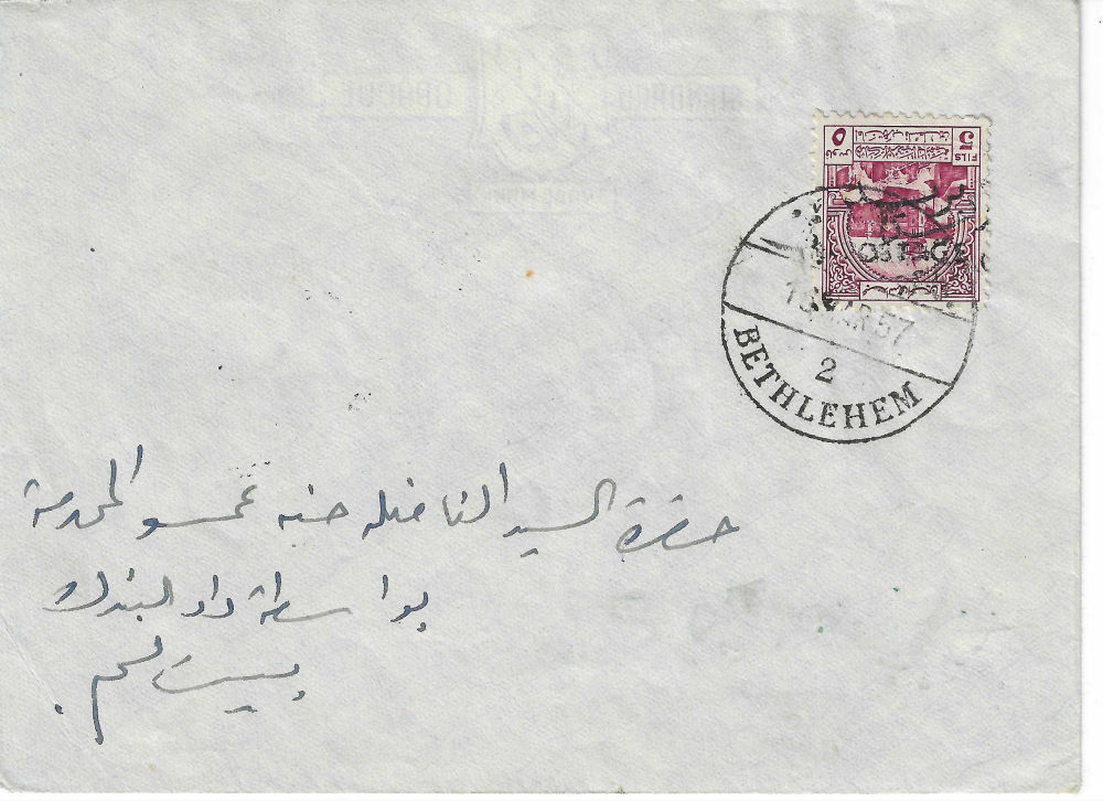 186 c imageBETHLEHEM 13 MAR 57 pmk ties 5 fils stamp to Arabic addressed cvr; OVERPRINT INVERTED (Image)