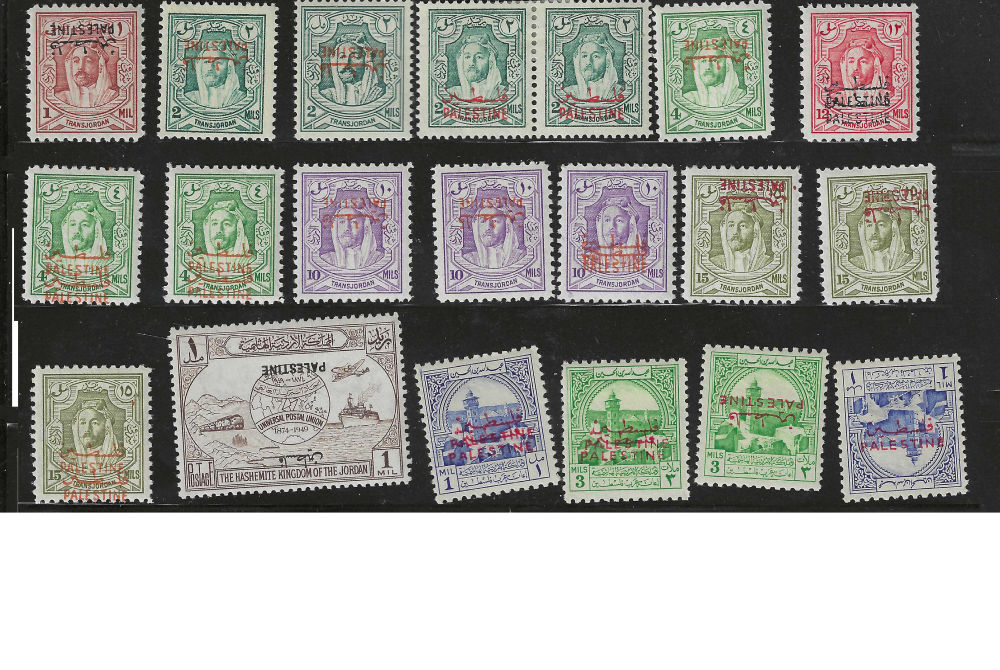 187 nh/og/O imageJORDAN FOR USE IN WEST BANK OVERPRINTS accumulation of over 40 stamps, many with various overprint errors (inverted, partial double, etc.). some are normal, duplication, (Image)