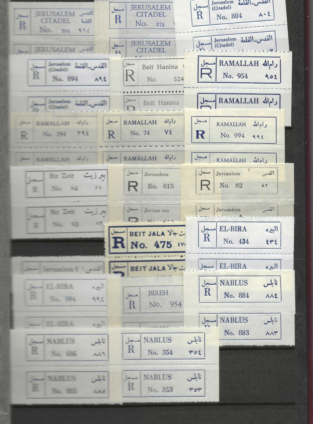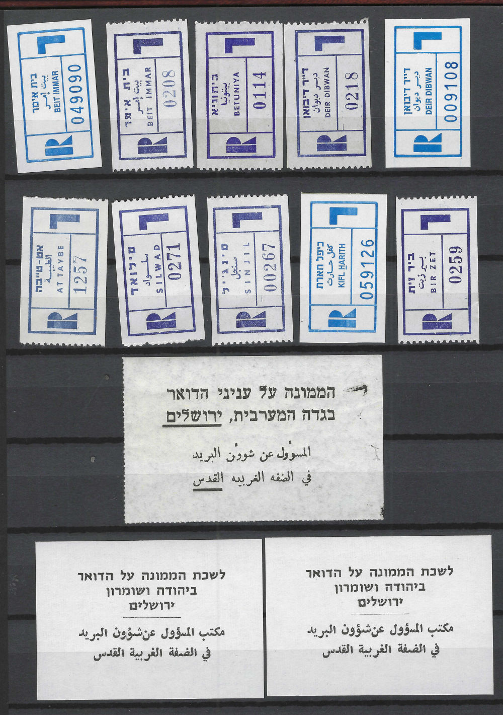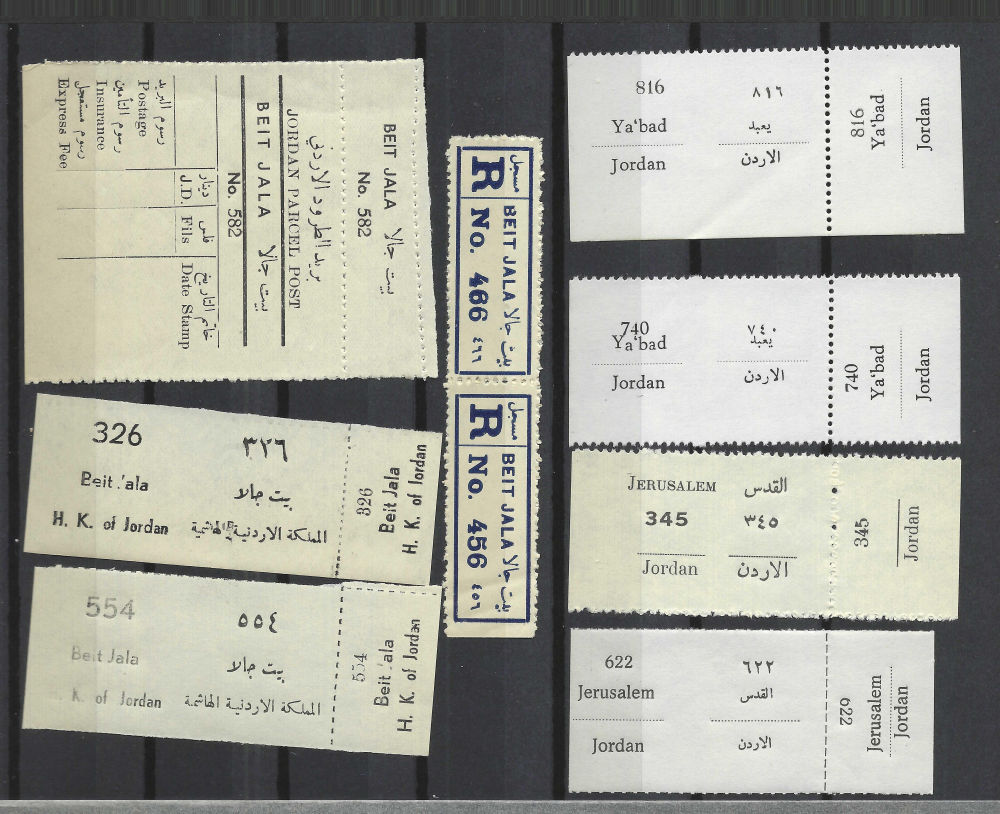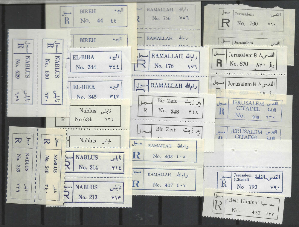 190 imageREGISTRATION LABELS; JUDEA & SAMARIA companion to prior lot; different localities; some strips; blank strip; Beit Jala Parcel Post; multiples for some; (Image) (Image 2) (Image 3) (Image 4) (All Images)