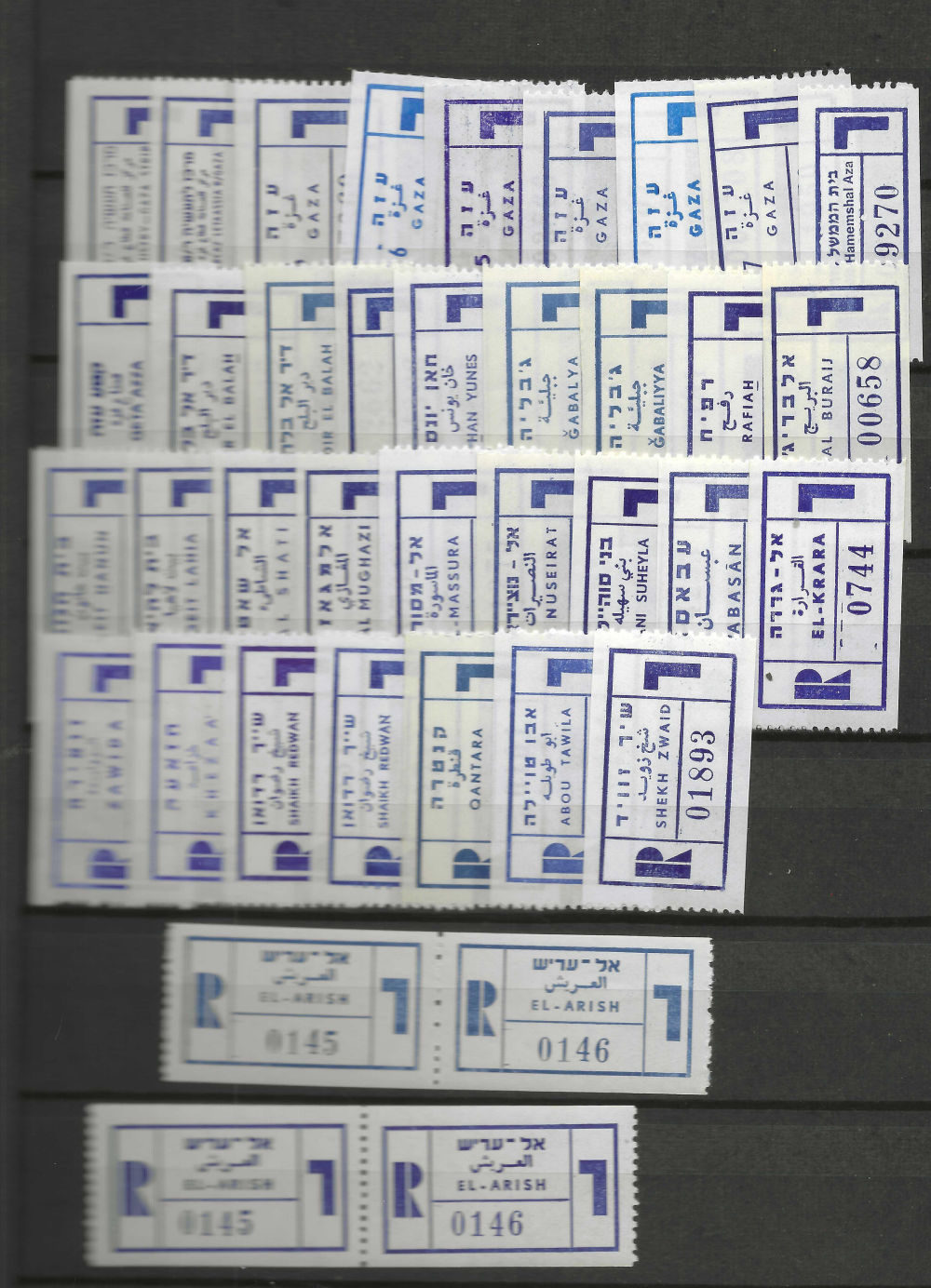 189 imageREGISTRATION LABELS; JUDEA & SAMARIA. GAZA, SINAI 1967-1995 various localities; multiples for some; about 175 items (Image) (Image 2) (Image 3) (Image 4) (All Images)