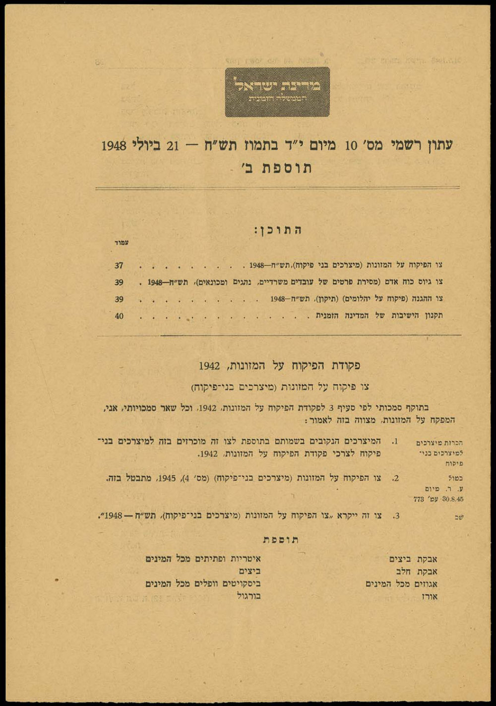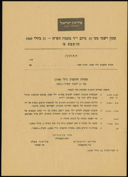 194 image1948 JUDAICA, ISRAEL ORGANIZES ITS GOVERNMENT Formal Paper, dated July 21, 1948, 11 pages; 4 measure 8½"x13", 7 measure 7"x10"; in Hebrew. Table of Contents 'State of Israel, Formal paper, Temporally assigned government, #10, 1 Tel Aviv 14th of Tamuz 07-21-1948, Page. 55, Table of Contents: Page 56 An announcement in the matter of adding to the order of government and laws, 1948. Page 56 An announcement in the matter of substitutes of the state's party members. Page 56 Appointing of officers Page 57 Appointing of a supervisor of transportation as an official authority. Page57 Appointing of a supervisor of diamonds as an official authority. Page 57 Court orders. Page 58 Announcements of properties sales. Page 58 Announcements by the order of partnerships. Page 58 Correcting errors. Addition A page 23 Budget orders (July 1948), Addition B Page 37 Order for supervision of foods. Page 39 Order of human resource recruitment (getting office employ's details, drivers, technicians) 1948 Page 39 Defense order (for supervising diamonds) (correction) 1948, Page 40 Meetings protocol of the temporary government.' Fine, with light edge wear. (University Archives LOA). (Image) (Image 2) (Image 3) (All Images)