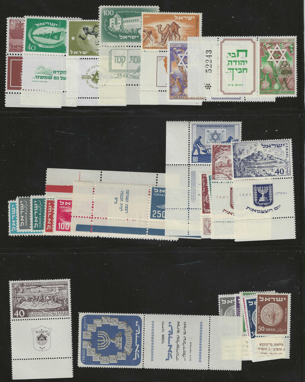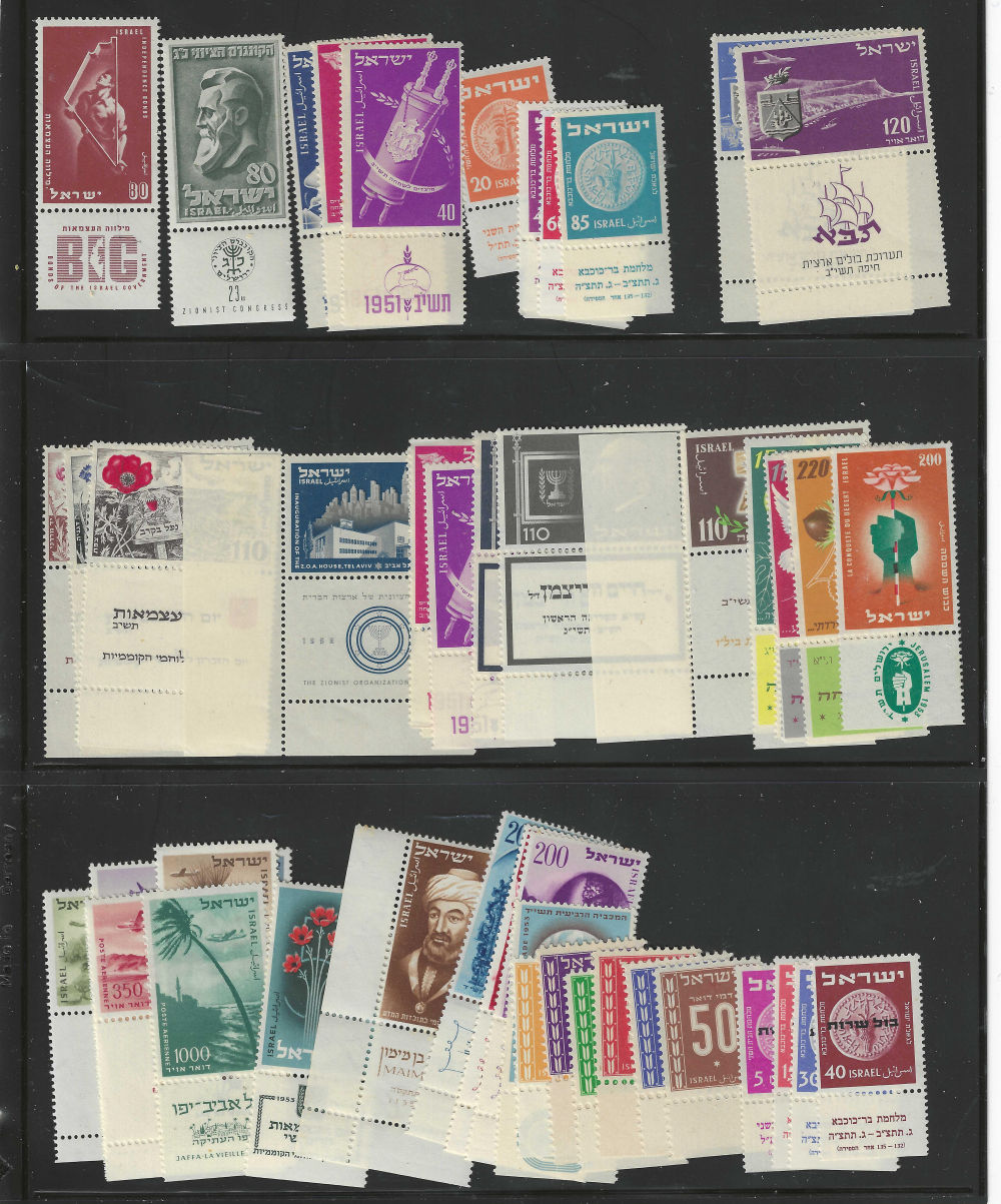 195 nh image1949-1954 TABS (1) low value Doar Ivri (2) First Festival with and without bars (3) Road to Jerusalem (4) flag, left & right (5) Petach Tikvah, left & right (6) UPU (7) Mered 1 (8) Bonds (9) Herzl (10) 1951 New Year (11) 1952 Coins (12) Taba airmail (13)1952 Independence (14) ZOA (15)1951 New Year (16) Weizman (17) BILU (18) Desert (19) 1952 New Year (20) Landscape air – some (21) 1953 Independence (22) Maimonides (23) 1953 New Year (24) officials (25) 2nd dues (26) 1950 Independence (27) Maccabiah (28) Hebrew University (29) Negev Camel (30) 1950 New Year (31) First Airmails (32) JNF (33) 1951 Independence (34) Menorah (35) Tel Aviv (36) MERED 2 (Image) (Image 2) (Image 3) (All Images)