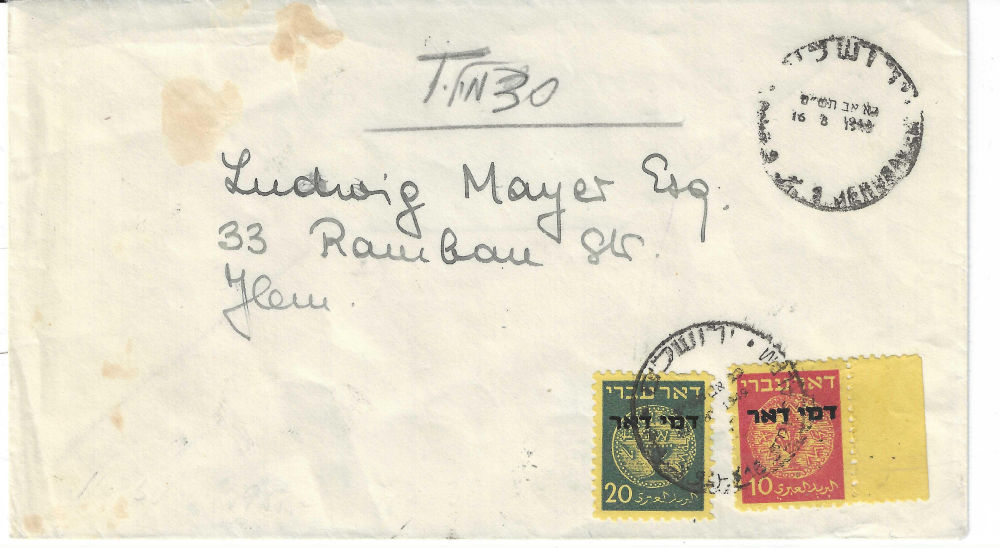 98 c image10 & 20 MIL tied by JERUSALEM 16/8/1948 to stampless cvr, mss T 30 MIL., (Image)