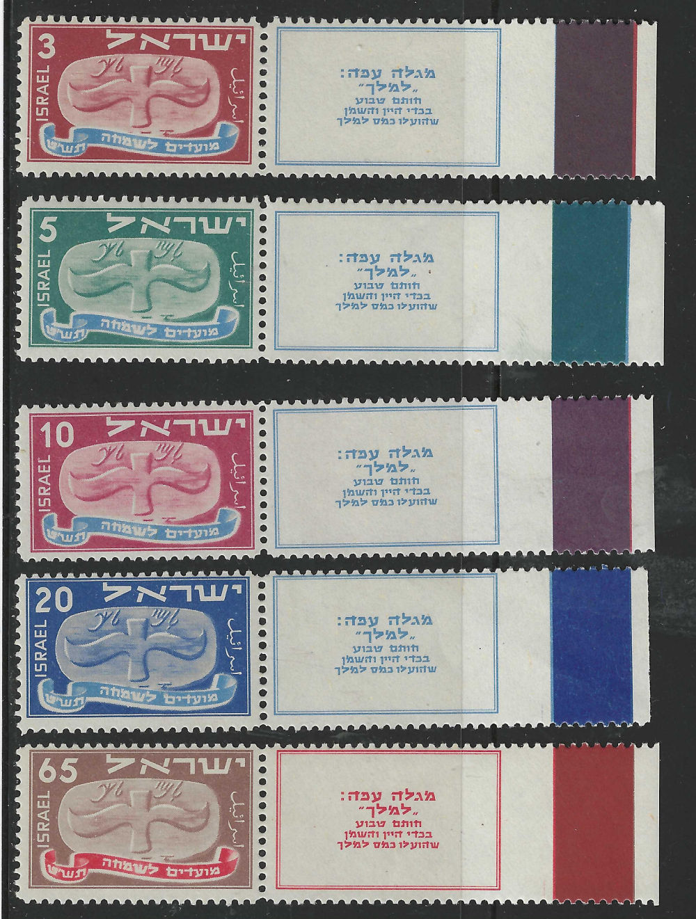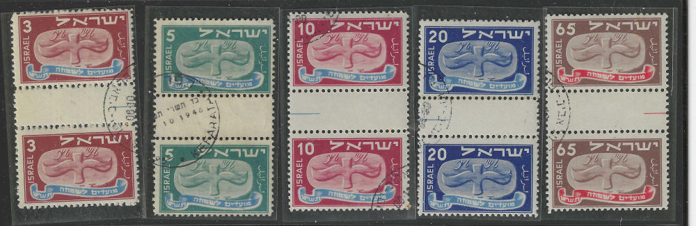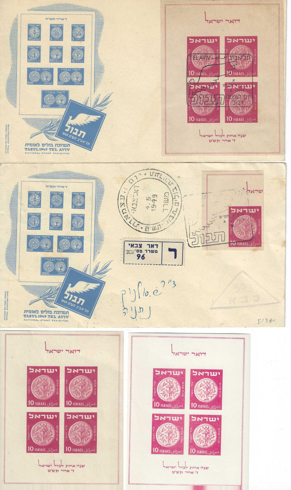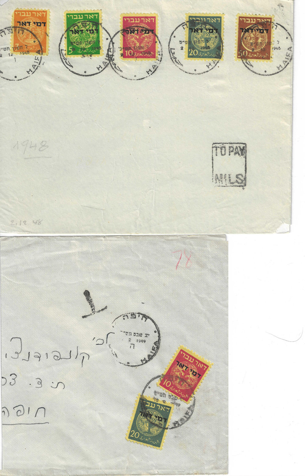 100 c imageFIRST DUES (1) full set tied by HAIFA 2/12/1948 pmks to unaddressed cvr, TO PAY MILS hstmp (2) full set tied by TEL AVIV 26/4/1950 pmks to unaddressed cvr (3) full set tied by TEL AVIV 26/12/1950 pmks to unaddressed cvr with cachet for 5709 New Year (4) 3 pr tied by TABUL (5) 10 & 20 tied by HAIFA 13/2/1949 pmk to partial cvr addressed to Haifa, “T” hstmp (6) 4 covers with Hebrew text indicating that return postage will be paid. 3 mil dues on back (Image) (Image 2) (All Images)
