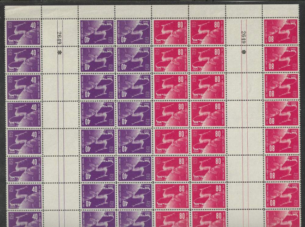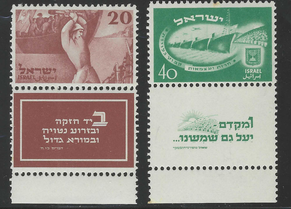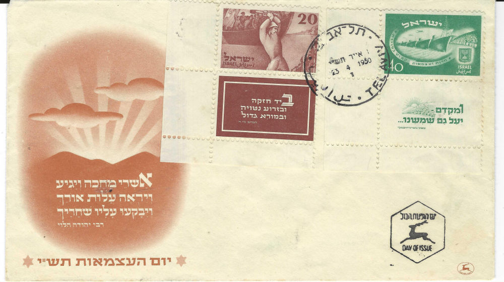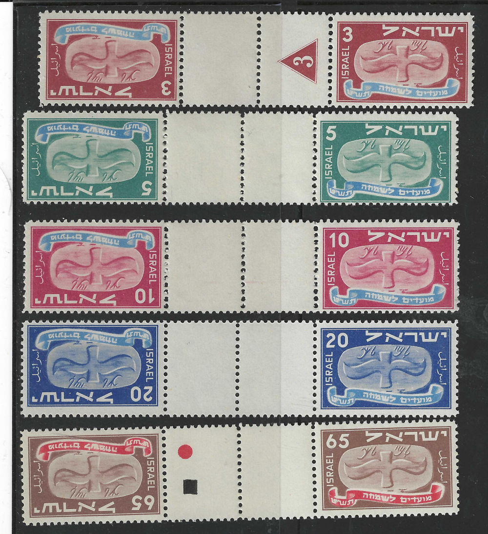 100 c imageFIRST DUES (1) full set tied by HAIFA 2/12/1948 pmks to unaddressed cvr, TO PAY MILS hstmp (2) full set tied by TEL AVIV 26/4/1950 pmks to unaddressed cvr (3) full set tied by TEL AVIV 26/12/1950 pmks to unaddressed cvr with cachet for 5709 New Year (4) 3 pr tied by TABUL (5) 10 & 20 tied by HAIFA 13/2/1949 pmk to partial cvr addressed to Haifa, “T” hstmp (6) 4 covers with Hebrew text indicating that return postage will be paid. 3 mil dues on back (Image) (Image 2) (All Images)