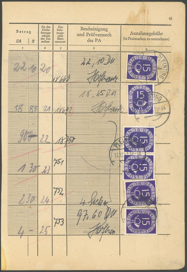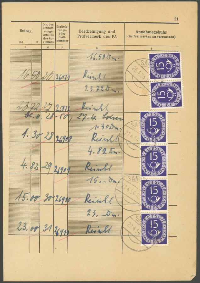 FEDERAL REPUBLIC GERMANY. 1954, 15 Pf. Posthorn in a horizontal pair with 4 single stamps ditto. On post document, superb