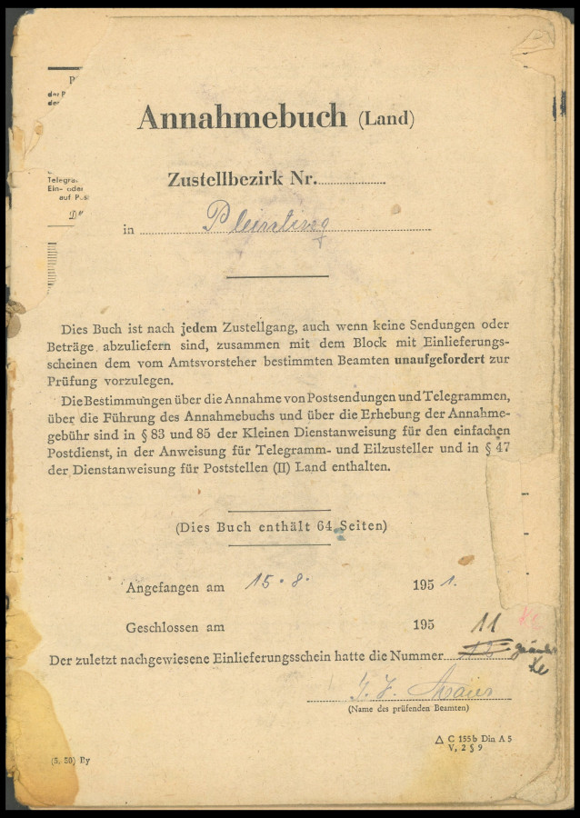 FEDERAL REPUBLIC GERMANY LOTS. 1951 / 4 receipt book (country), deliver district Pleinting, 64 sides, the charges were mostly with 15 Pf. Building series or posthorn cleared, various traces of usage (Image)