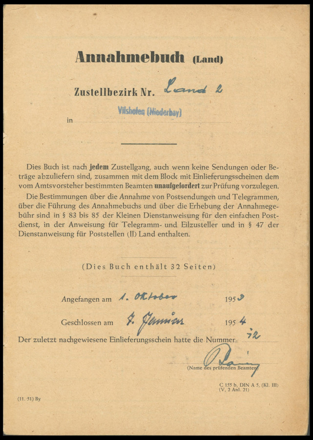 FEDERAL REPUBLIC GERMANY LOTS. 1953 / 4, receipt book (country 2), deliver district Vilshofen, 32 sides complete, the charges were almost only with 15 Pf. Posthorn cleared, superb (Image)