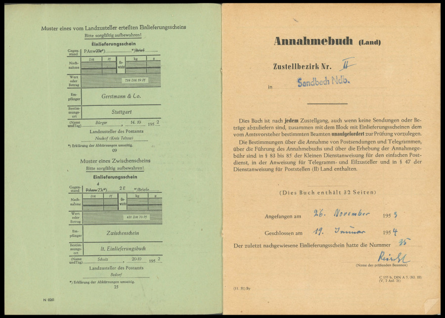 FEDERAL REPUBLIC GERMANY LOTS. 1953 / 4, receipt book (country), deliver district Sand stream, 32 sides complete with lid, the charges were almost only with 15 Pf. Posthorn cleared, superb (Image)