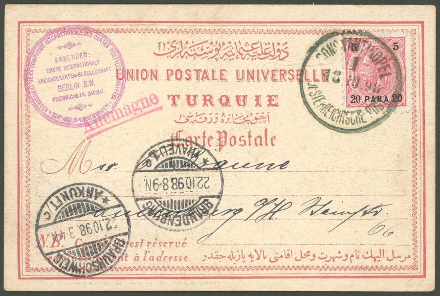 AUSTRIA POST IN THE LEVANT. 1898, 20 P. On 5 Kr. On picture postcard from CONSTANTINOPEL 1 to Brandenburg, superb (Image)