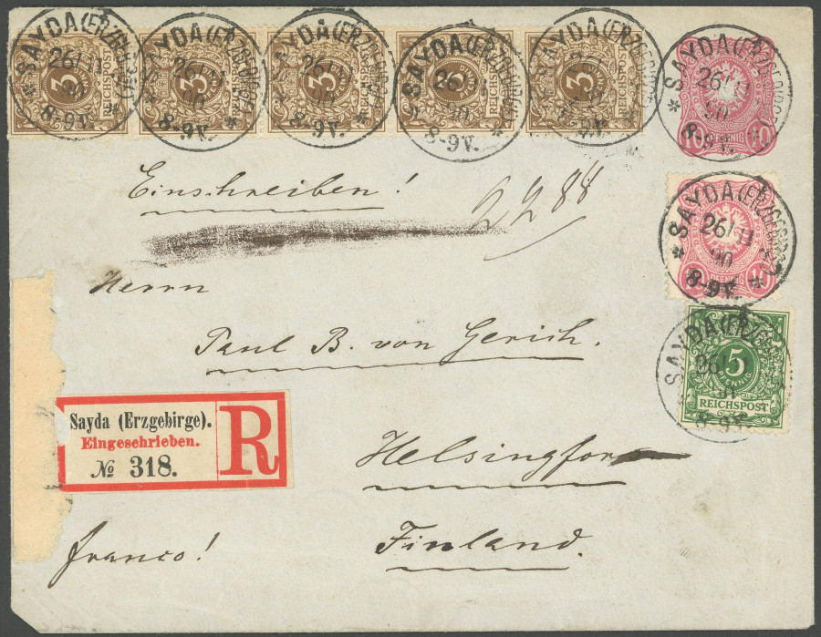 GERMAN REICH PENNY (E). 1890, 10 Pf. Postal stationery cover with mixed franking, registered cover from SAYDA to Finland, scarce combination, fine (Image)