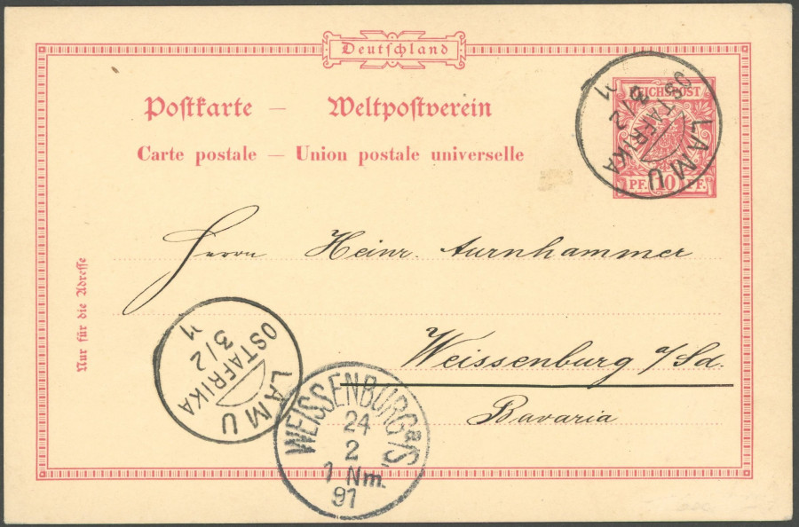 GERMAN EAST AFRICA LAMU. LAMU 3.2.91 on 10 Pf. Eagle postal stationery postcard to Weissenburg, superb in every respect (choice copy), R! Expertized Bothe (Image)