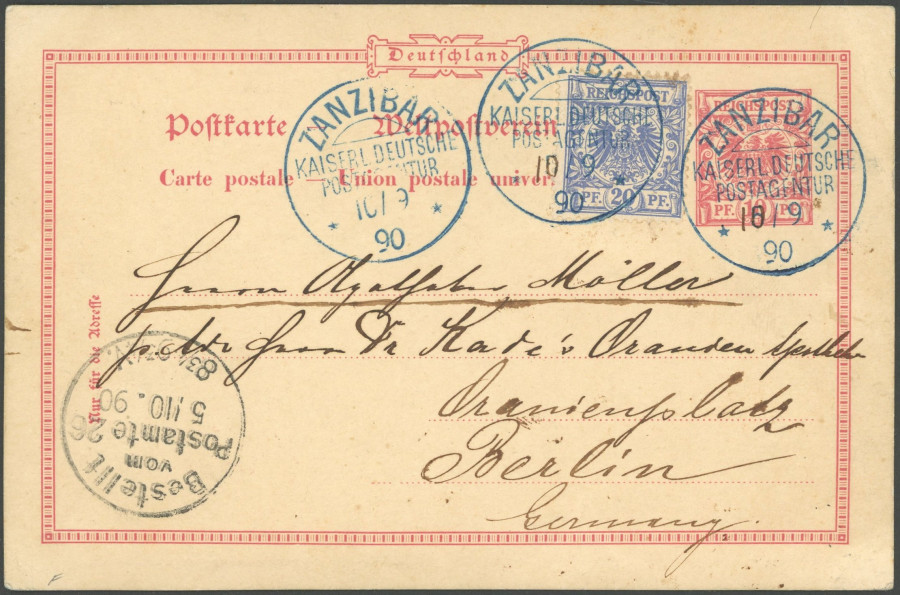 GERMAN EAST AFRICA ZANZIBAR. ZANZIBAR 5.9.90 in blue (the today's date on 10 handwritten improved) on 10 Pf. Red postal stationery postcard with 20 Pf. Ultramarine (upper Zhnung a little blotched), portogemß as