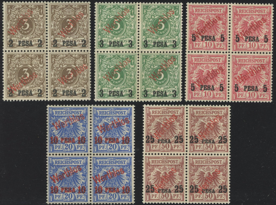 GERMAN EAST AFRICA. Essays: 2 - 25 P. Crown / eagle with red overprint valueless, the 10 Pesa with red in lieu of black overprinted value, in unused block of four, very fine set, RR! Issued only 100! Michel (14.000.-) (Image)