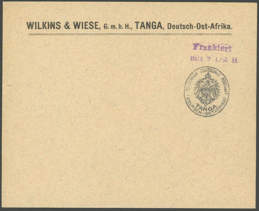 GERMAN EAST AFRICA POSTAL STATIONERIES. Prepayment of postage: TANGA 71 / 2 H. Violet, unused cover of the Wilkens and grassland, superb (Image)