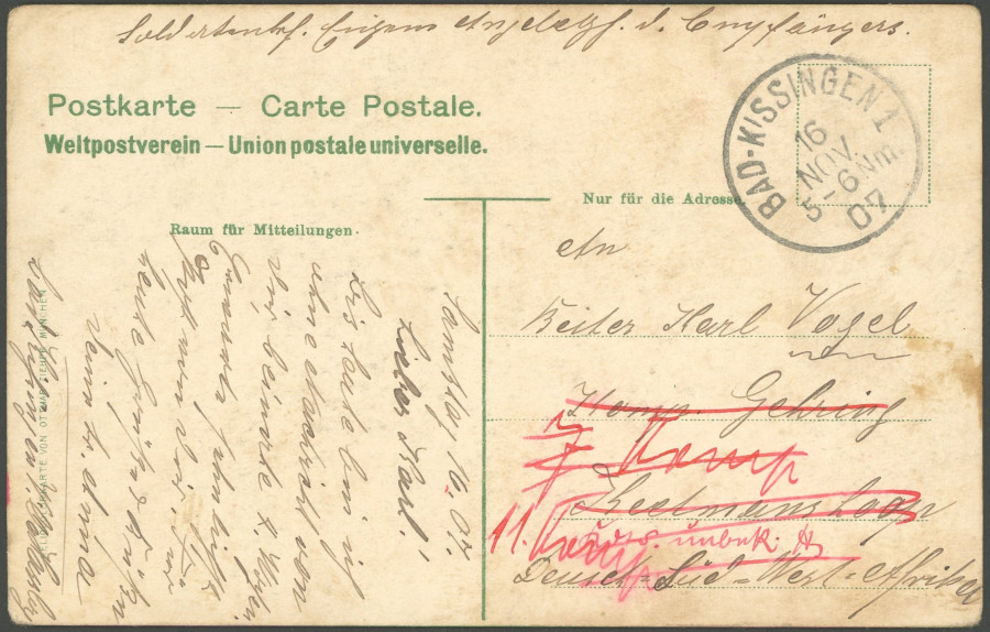 GERMAN SOUTHWEST AFRICA. 1907, coloured picture postcard from BAD KISSINGEN to Keetmanshoop, superb (Image)
