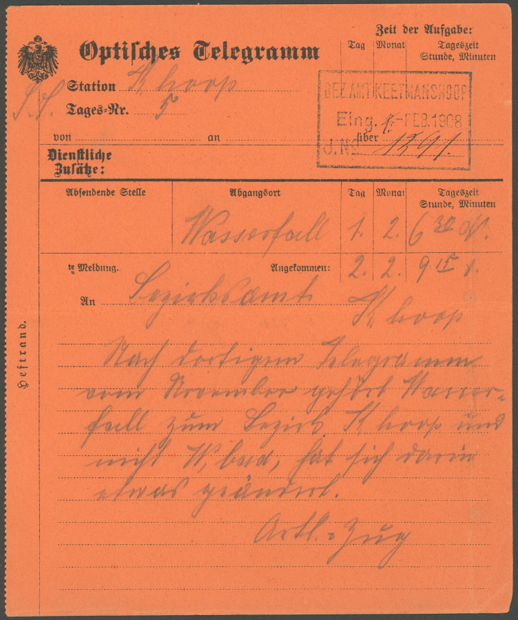 GERMAN SOUTHWEST AFRICA. 1.2.1908, optical telegram in dark orange from waterfall to the district office in Keetmanshoop, with entrance cancel, superb, R! (Image)