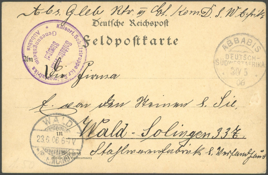 GERMAN SOUTHWEST AFRICA POSTMARK. ABBABIS, 30.5.06, on fieldpost card with Soldier letter stamp convalescent home Abbabis to Wald Solingen, superb (Image)