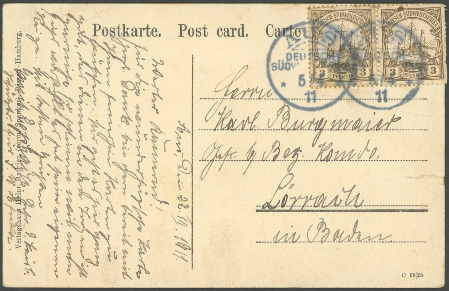 GERMAN SOUTHWEST AFRICA POSTMARK. From, 5.4.11, 2 x on picture postcard to Lörrach, with 2 time 3 Pf., very fine (various Mngel)